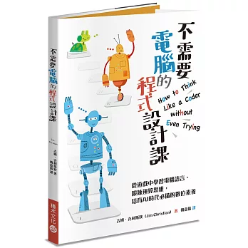 你是不是想學程式語言卻不知從何開始?別擔心,你不需要急著弄懂Java、Python、Ruby這些程式語言到底有什麼不同,即使不熟悉電腦的操作也沒關係。這本書將一步一步拆解程式設計師的思考模式,帶領你從故事及遊戲中尋找規則,學會以同樣的方式解決問題。對於不懂電腦的人來說,看到「迴圈」、「條件陳述式」、「運算子」、「變數」這些令人摸不著頭緒的專用術語就夠令人害怕的了,不過這些概念其實透過骰子或撲克牌遊戲就可以輕鬆學會並理解。