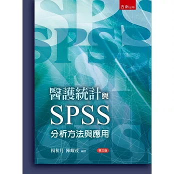 |a統計方法經常要面對數值計算,然而今日科技如此進步,已開發有各種統計軟體,學生在學習統計方法時當不至於感到霧煞煞了。但是在學習統計方法處理問題時,最常令人感到困擾的是:「收集到的數據要選用何種的統計處理方法才好呢?」、「要如何輸入數據,有無明確的輸入步驟呢?」、「輸入後,在進行統計處理時,有無明確的分析步驟呢?」、「分析結果要如何解讀才好呢?」此的確是學生學習統計方法時最為煩惱的,然而此種煩惱是多餘的,任何人只要能利用本書參照使用就行,可以說非常簡便。書中的統計方法其涵蓋內容甚為豐富,上篇有23章,下篇有22章,幾乎常用的統計方析方法都收錄於其中,因此使用時不至於有所短缺之憾。本書的撰寫是以醫學院相關科系、護理學院相關科系、公衛學院相關科系的學生為對象,從大學部到研究所均可使用,只要把統計方法配合本書的分析方法,即可參照使用,學生再也不會視統計為畏途了。