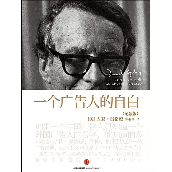 在過往的廣告史上,可能是對廣告人影響最大的一本,很少有廣告人沒有看過這本書,一直到現在應該還是,相信未來還是這樣。有些讀者不是廣告人,而是從事營銷工作,是廣告人的客戶,對他們來講,這本書應是最好地了解廣告業及廣告人的書。而且,就算你已經從事廣告業多年,仍可以偶爾拿出來看看,仍會對你有許多啟發。大衛‧奧格威,David Ogilvy 1911-1999,出身英國的大衛奧格威,是現代廣告業的大師級傳奇人物他於創立了奧美廣告公司開啟了現代廣告業的新紀元。他確立了奧美這個品牌,啟蒙了對消費者研究的運用,同時創造出種嶄新的廣告又化。奧格威早年做過廚師、炊具推銷員,後移居美國在喬治蓋洛普博士的受眾研究所擔任助理調查指導。二戰期間先後在英國安全協調處(British Seourity Coordination)和英國駐美大使館任職。後在賓夕法尼亞州做農夫。1948年,奧格威在紐約以6000美元創辦了奧美廣告公司,隨後以創作許多富有創意的廣告而贏得盛譽。他的作品機智而迷人,但最重要的是他堅持它們必須有助於銷售。他把廣告業的經營和專業化推向頂峰,他的價值觀造就出個全球性的傳播網絡,他睿智雋永的風格不但塑造了奧美廠告,問時更深深影響著整個廣告業的發展。