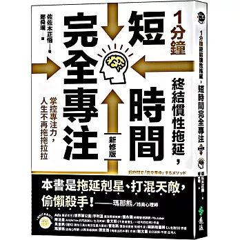 本書根據心理學與腦科學研究,介紹「控制專注力的方法」,幫助讀者改善習慣性拖延的毛病,達到高效率與高執行率的效果。