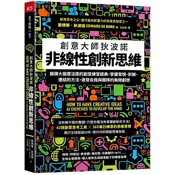 免靠靈感,超越慣性,讓非線性思維成為本能:在本書中,狄波諾圍繞隨機單詞打造了62個不同功能的練習題,幫助你增進創意與水平思考的能力,所有練習都非常簡單、實用,且饒富趣味,一個人或一群人都能做。你有五種方法來隨機取得單詞,活化大腦思考的靈敏度、寬廣度,書中提供思考工具的功能多樣又豐富,刺激你發掘無限制的奇思妙想,有效構思無數創意點子,不論企劃提案、說故事、解決難題等都好用。